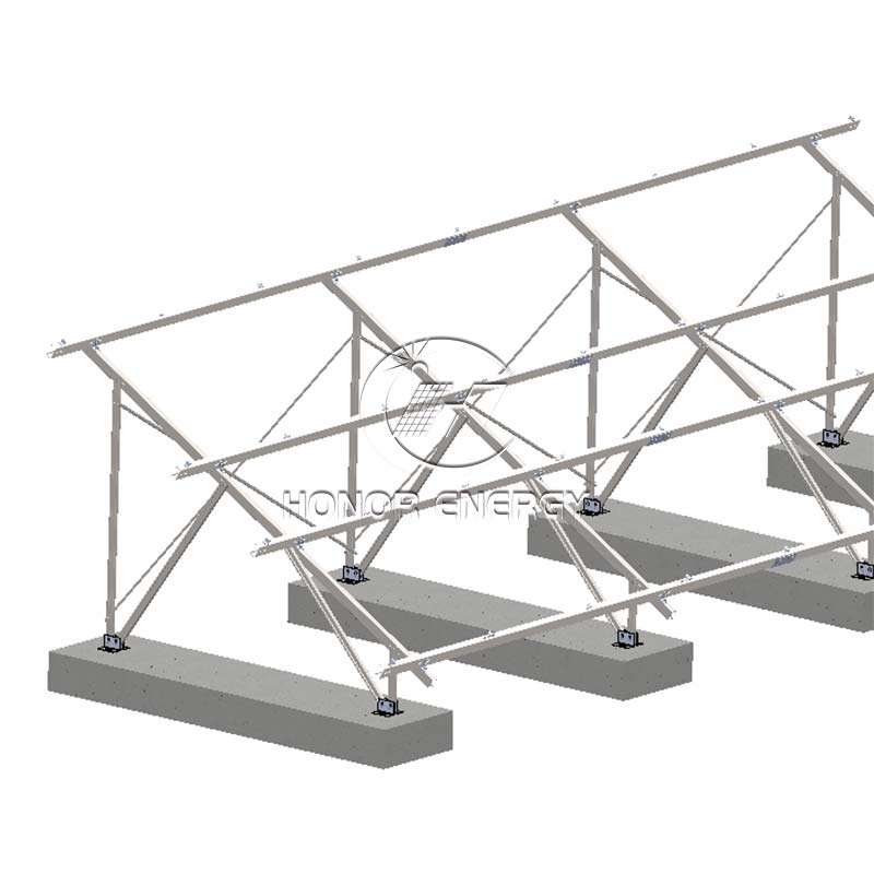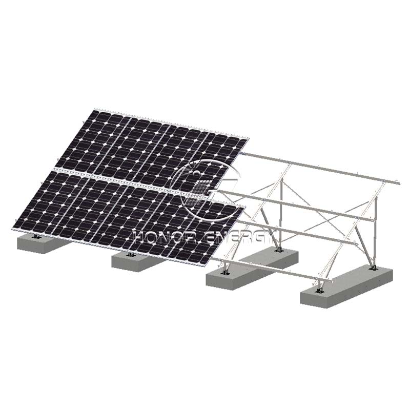 కాంక్రీట్ స్టీల్ సోలార్ ఫ్లాట్ రూఫ్ మౌంట్ అనేది హానర్ ఎనర్జీచే తయారు చేయబడిన ఒక రకమైన ఉత్పత్తి. ఇది ఫోటోవోల్టాయిక్ మాడ్యూల్స్పై గాలి మరియు మంచు లోడ్లను నిరోధించడానికి, అసలు పైకప్పు నిర్మాణంపై డ్రిల్లింగ్, పియర్సింగ్ లేదా వెల్డింగ్ చేయకుండా నిరోధించడానికి ప్రీకాస్ట్ కాంక్రీట్ పీడెస్టల్స్ ద్వారా తగినంత బరువును అందిస్తుంది.